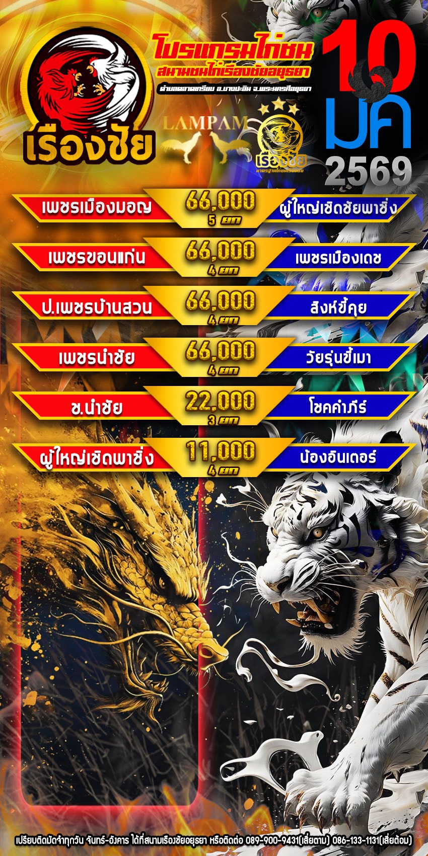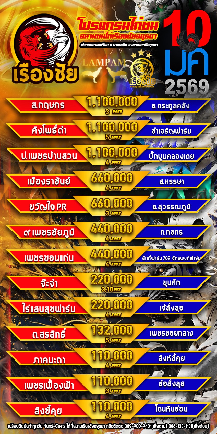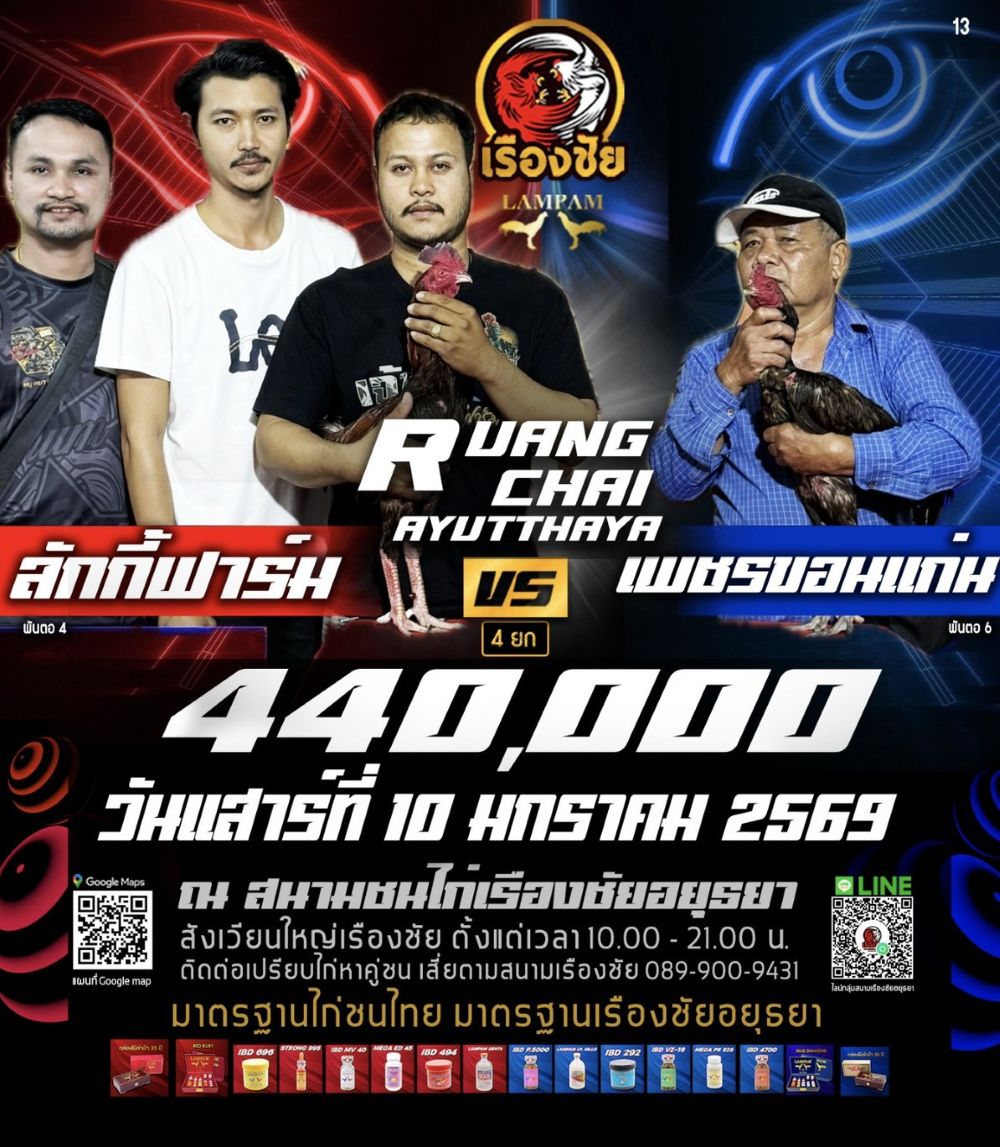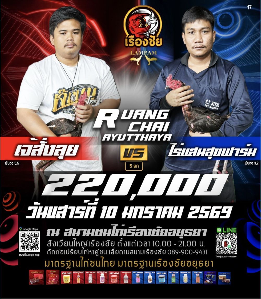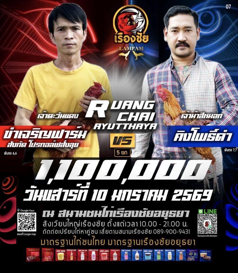 โปรแกรม สนามชนไก่เรืองชัย วันเสาร์ที่ 10 มกราคม 2568
