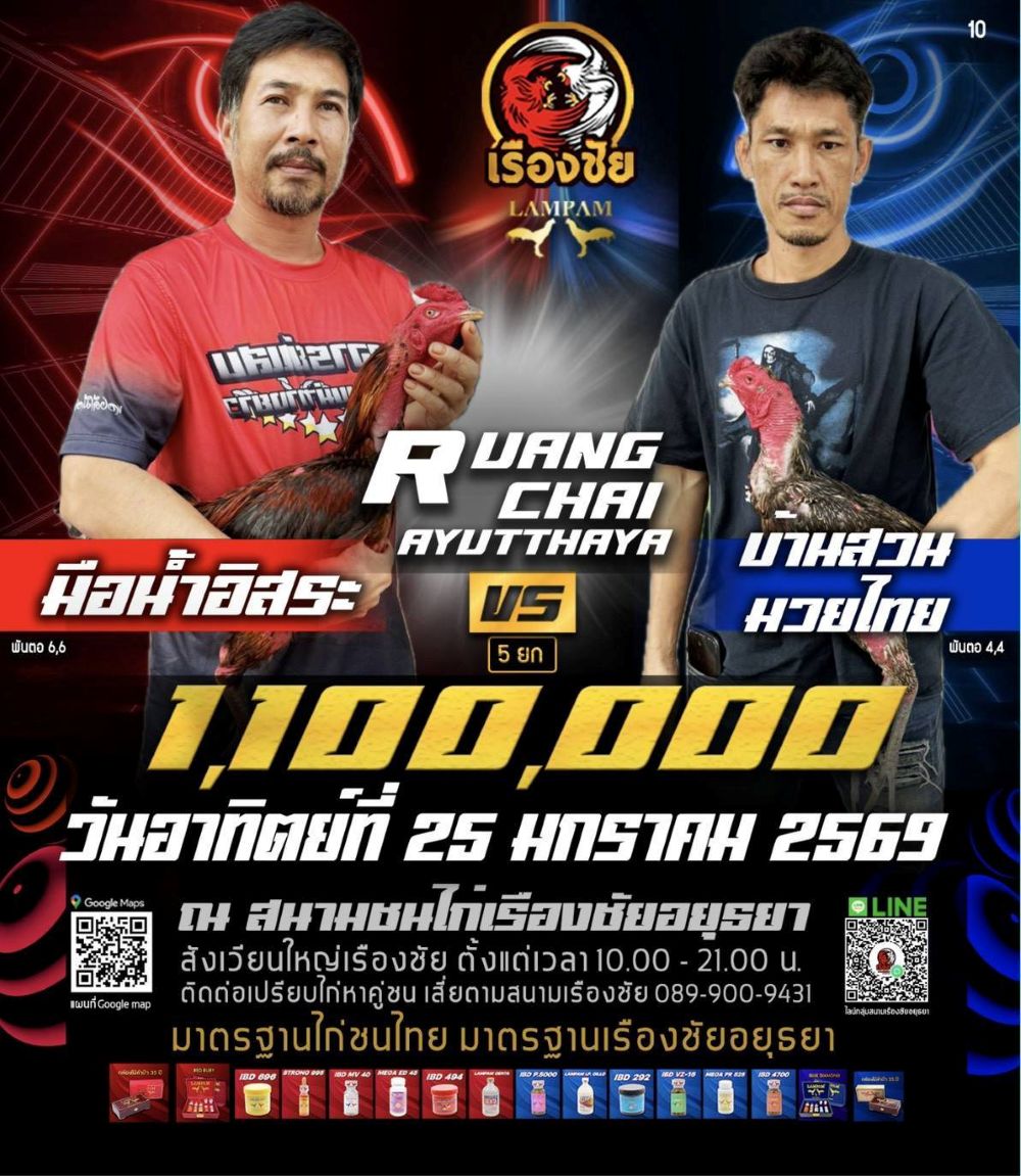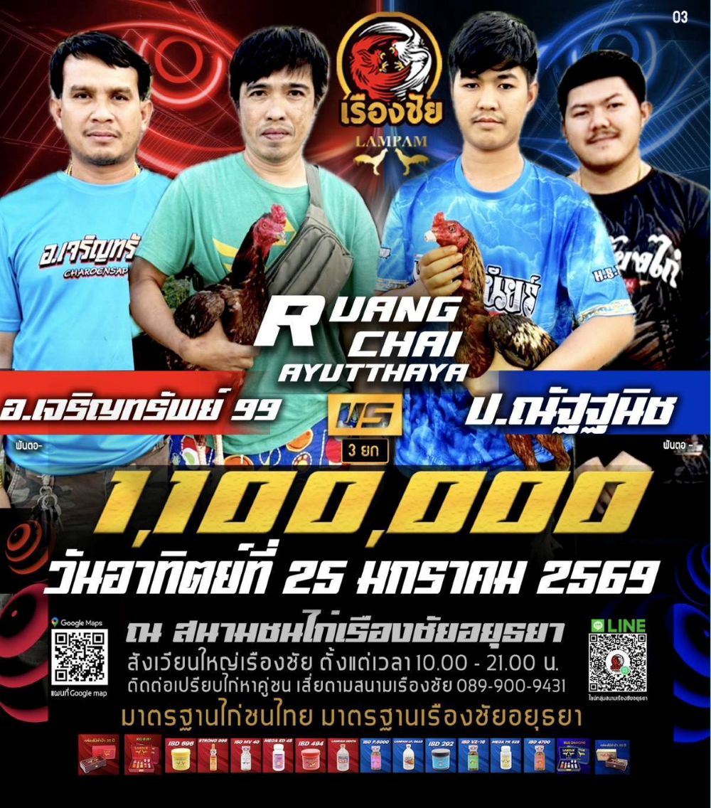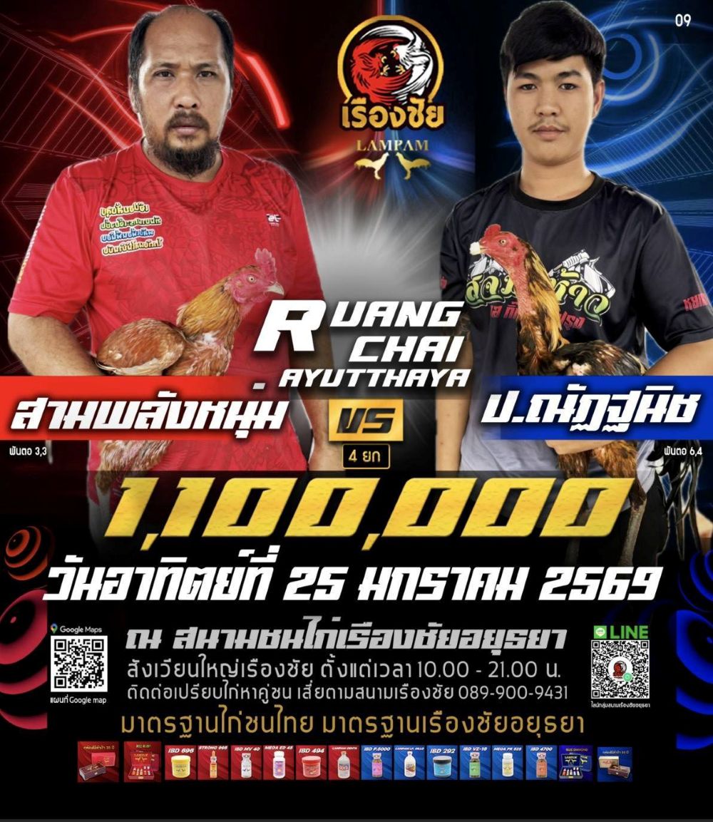 โปรแกรม สนามชนไก่เรืองชัย วันอาทิตย์ที่ 25 มกราคม 2568
